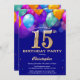 15 Aniversário Marinho Azul e Dourado Balões Coloridos e Confetti Convite. Para mais personalização, clique no botão "Personalizar" e use nossa ferramenta de design para modificar este modelo.