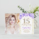 15 com a sua foto. Possui um confete de ouro e rosas roxos. Design floral clássico com brilho falso. Perfeito para uma elegante celebração do décimo quinto dia.