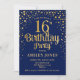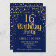 16º Convite de aniversário. Design elegante em azul marinho e ouro brilhante falso. Possui fonte de script na moda e confetti. Envie-me uma mensagem se precisar de idade personalizada.