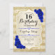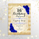 16.º Convite de Aniversário. Design elegante em ouro e azul real. Apresenta fitas de ouro com brilho sutil, fonte de script na moda e confetti rosa de de safira. Perfeito para uma festa de aniversário de vidro.