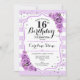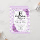 16.º Convite de Aniversário. Design branca elegante com falso brilho. Possui listras brancas com rosas roxos. Perfeito para uma elegante décima sexta festa de aniversário.