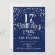 17º Convite de aniversário. Design elegante em azul marinho escuro e prata brilhante fraca. Possui fonte de script na moda e confetti. Envie-me uma mensagem se precisar de idade personalizada.