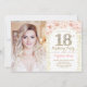 18º convite de aniversário com sua foto. Possui um confete dourado e rosas cor-de-rosa pinceladas. Design floral clássico com brilho falso. Perfeito para uma elegante celebração de 18 dias.