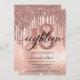 Moderno, tenente 18º convite de aniversário. Design apresenta gotas de brilho rosa dourado, folha falsa e fundo brilhante, número 18 em letra rosa dourada da tendência, script de tipografia dezoito e detalhes da festa.