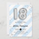 18º convite de aniversário. Design elegante em prata brilhante falso com listras azul e brancas de aqua turquesa. Convide cartão com balões prateados número 18, fonte de script com confetti. Perfeito para uma comemoração de na moda 18 dias. Envie-me uma mensagem se precisar de idade personalizada.