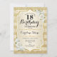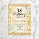 18º Convite de Aniversário. Design floral elegante em ouro e branco. Apresenta fitas de ouro com brilho sujo, fontes de na moda de rosas brancas e confetti. Perfeito para uma festa de aniversário de vidro.