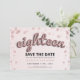 Design de "Oitava Festa de aniversário Salvar a Data" elegante com Rosa Dourado Blush Pink Balloon Letters & Glitter confetti e nome personalizado e texto de detalhes. Imprima sua família e amigos com este na moda e design glamouroso. Fácil de usar e fácil de personalizar. Peça a sua hoje!