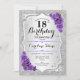 18º Convite de Aniversário. Design floral elegante em prata e roxo. Apresenta faixas de prata com brilho sujo, fontes de script na moda de rosa de de roxo e confetti. Perfeito para uma festa de aniversário de vidro.