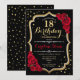 Convite para comemoração de 18 anos. Design preto elegante com ouro e rosas vermelhas brilhantes falsos. Perfeito para uma bolsa mensageifesta de aniversario elegante. Pode ser personalizado em qualquer idade.