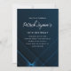 Convite de 18 de aniversário, azul escuro moderno e minimalista, com um sofisticado padrão geométrico do neon. Texto branco brilhante sobre fundo azul escuro realmente pop.