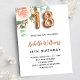 Um convite elegante para uma 18ª festa de aniversário. Um fundo branco chic. Decorados com um rosa de ouro e rosa cor-de-rosa-esbranquiçada, folhas de eucalipto florais, verdes, galhos, verde e borras de ouro. Personalize e o nome e os detalhes da festa. Letras pretas e ouros. O nome é escrito com um moderno estilo escrito à mão. O número 18 é escrito com uma fonte no estilo do balão de ouro. Traseira: cor de fundo rosa dourada.