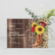 18º convite de aniversário para mulheres com botas de cowboy rústicas, girassóis amarelos brilhantes e belas rosas vermelhas sobre um fundo de madeira marrom escura.