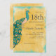 18.º convite de aniversário com um pavão verde e amarelo num fundo de aquarela amarela. O texto é personalizável para que este convite possa ser personalizado para qualquer idade.