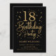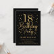 18th birthday party invitation in black and gold. Trendy modern design, perfect for a stylish men's or women's bday celebration. Features script font and confetti. Customize with your own details. Printed Zazzle invitations or instant download digital printable template.