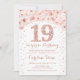 19º Convite de aniversário. Design elegante em ouro rosa e branco. Possui rosas cor-de-água pinceladas rosa, confetti e diamantes. Perfeito para uma comemoração de vidro.