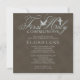 Primeira design de convite da Comunidade Santa para um rapaz que apresenta uma cruz clássica simples em marrom cinza com uma pomba de paz sobrevoando as palavras "Primeira Comunhão" em azul-casca-de-ovo, sobre um fundo em marrom angurado. Design original por Holiday Hearts Design (todos os direitos reservados).