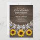 Convites de Renda e Girassóis Country de Madeira Rústica para o 20º Aniversário de Casamento. Personalizados para os detalhes da sua celebração. Você pode alterá-lo para aniversários de 10º, 30º, 40º, 50º, 60º etc. Caracteriza bela renda, girassóis e tipografia em um fundo de madeira escura rústica. Convites de aniversário de casamento elegantes e criativos para aniversários country. Este convite de aniversário de casamento foi projetado por superdazzle.com