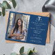 Modelo de cartão de convite para a festa de formatura da escola de enfermagem moderna, elegante, azul e branca, com sua foto e texto personalizados.