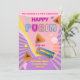 Happy Purim Festival Modern Invitation card for Family or Kids Party. Translation from Hebrew: Happy Purim! Purim Jewish Holiday poster with stars of David, traditional Hamantaschen cookies, gragger toy noisemaker, balloons, musicians, masks, Purim basket, festive confetti, fireworks on colorful abstract festive background.