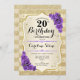 Convite de aniversário de 20. Design elegante em ouro e roxo. Apresenta faixas de ouro com brilho sutil, fontes de script na moda de rosa de de roxo e confetti. Perfeito para uma festa de aniversário de vidro.