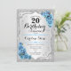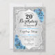 Convite de aniversário de 20. Design elegante em prata e azul gelado. Possui riscas prateadas com brilho inverso, fonte de script na moda e confetti rosa de de de turquesa. Perfeito para uma festa de aniversário de vidro.