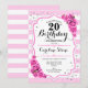 Convite de aniversário de 20. Design cor-de-rosa branca esbranquiçada elegante com falso brilho. Listras prateadas e brancas com rosas cor-de-rosa. Perfeito para uma elegante festa de aniversário de vinte.