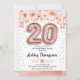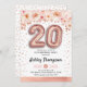 convite de aniversário 20. Design elegante em ouro brilhante de rosa com sotaque floral. Convidar cartão com rosa dourado número 20 balões, fonte de script com confetti. Coral cor-de-rosa, branco. Perfeito para uma comemoração de na moda 20 dias. Envie-me uma mensagem se precisar de idade personalizada.