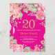 Convite de Aniversário para 20 Floral para Mulheres. Flor Botânica De Aquarela. Dourada Glitter. Fundo Rosa Quente. Flores Florais De Peões Rosa. Aniversário Adulto.