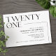 Aniversário de 21 anos moderno convida com texto de cabeçalho "vinte e um" em letra de destaque. Design fora do centro com um esquema simples de preto e branco.