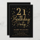 21st birthday party invitation in black and gold. Trendy modern design, perfect for a stylish men's or women's bday celebration. Features script font and confetti. Customize with your own details. Printed Zazzle invitations or instant download digital printable template.