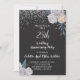 Um convite elegante de 25 anos de aniversário de casamento com brilho prateado em preto e bordas florais de rosas brancas e tipografia em letra cursiva branca.