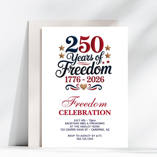Create your own 250th American Birthday Party Invitation! Personalize this design with your own text. You can further customize this design by selecting the "Edit Details" button if desired.