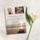Elegante convite ao serviço memorial, com uma concha deitada na praia no nascer do sol e duas fotos de seu amado no topo para um serviço de memorial sobre temas oceânicos ou um serviço de funeral acontecendo no lado do oceano ou na praia.