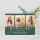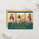 Compartilhe a alegria de um segundo grau ou formandos e convide a família e os amigos a celebrarem com estes convites personalizados de 3 imagens verdes e dourados. Todas as imagens e textos são simples de personalizar. (DICA DE IMAGEM: Uma maneira fácil de centralizar uma foto exatamente como você deseja é recortá-la antes de carregá-la no site do Zazzle.) Este modelo é formatado para uma festa de formatura, mas pode ser facilmente personalizado como um convite ou um cartão de anúncio de casa aberta. Simplesmente mude o texto para incluir quaisquer detalhes de sua escolha, como nomes de pais, honras especiais, título de grau, citação de inspiração favorita, planos futuros de formandos ou novo endereço. Se houver algum texto não desejado, simplesmente exclua-o. Design apresenta um fundo verde, boné de conselho de morteiro de folha falsa, caligrafia de script de estilo manuscrito, tipografia moderna minimalista e três fotos de sua escolha, como fotos de mais velho ou imagens da cerimônia de início. Observe que o ouro é impresso a cor, não a folha metálica. Esta elegante carta de convite para a formatura é uma maneira moderna e chique de começar a sua celebração especial. Parabéns ao formando!