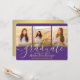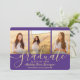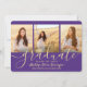 Compartilhe a alegria de uma formatura do ensino médio ou faculdade e convide familiares e amigos para celebrar com esses convites personalizados de colagem de 3 fotos em roxo e dourado. Todas as imagens e textos são fáceis de personalizar. (DICA DE COLOCAÇÃO DE IMAGEM: Uma maneira fácil de centralizar uma foto exatamente como você quer é cortá-la antes de fazer o upload para o site da Zazzle.) Este modelo é formatado para uma festa de formatura, mas pode ser facilmente personalizado como um convite para uma casa aberta ou cartão de anúncio. Basta alterar o texto para incluir quaisquer detalhes de sua escolha, como nomes dos pais, honrarias especiais, título do diploma, citação inspiradora favorita, planos futuros do graduado ou novo endereço. Se houver algum texto que não seja desejado, basta excluí-lo. O design apresenta um fundo roxo, boné de formatura em folha falsa, caligrafia de estilo manuscrito, tipografia minimalista moderna e três fotos de sua escolha, como fotos de formatura ou imagens da cerimônia de formatura. Por favor, note que o dourado é uma cor impressa, não folha metálica. Este cartão de convite de formatura elegante é uma