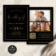 Elegante 3 Fotografias Script Line Border QR Code Dourado Casamento Preto. Disponível digitalmente e impresso. elegância clássica em preto e ouro com este design de texto. O Casamento de está em um roteiro de na moda, e o resto das palavras que você pode personalizar facilmente. Substitua as três fotos no verso por você e adicione um código QR ao seu site de casamento para a conveniência de seus convidados digitalizarem para o rsvp e verem mais detalhes. Você também pode alterar a cor do texto e do plano de fundo em cada lado, se desejar, por meio da opção editar mais.