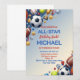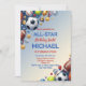 A 3D Sports Champion All-Star birthday invitation featuring photorealistic basketball, baseball, soccer, football, and tennis balls with golden trophy accents and hexagonal geometric patterns. Perfect for sports-loving kids celebrating an all-star birthday party.