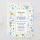 Uma estrela azul e dourada, e manchas, como confete gigante, convite de festas de 4 anos.