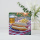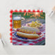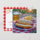 Um cachorro quente com a palavra "AMÉRICA" escrita na mostarda é colocado em uma placa de bandeira patriótica com batatas fritas e caneca de cerveja. Todo o texto pode ser alterado.
