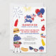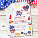 Convite para o CHURRASCO da celebração do dia 4 de julho - fácil de editar a redação para incluir as vantagens do partido e quaisquer informações adicionais, como diversão por sol comida ou cervejas e hambúrgueres; trazer um prato lateral, faísca, cadeira de jardim, etc. A design apresenta balões e fogos de artifício, comida de churrasco, sobremesas e óculos de sol legal. Tem um tema patriótico de cor branca vermelha e azul com muitas estrelas e listras.