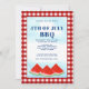 Convide familiares e amigos para o seu churrasco de verão com este convite de 4 de julho. É decorada com melancias de aquarelas e um céu azul sobre um fundo de controlo de búfalos vermelho e branco. Facilmente personalizável. Este convite festivo é perfeito para qualquer tema de celebração do dia 4 de julho. Use a Ferramenta Design para alterar o tamanho, o estilo ou a cor do texto. Porque nós criamos a nossa trabalho de arte, você não encontrará esta imagem exata de outros designers. Original Watercolor © Michele Davies.