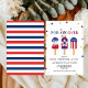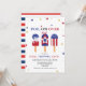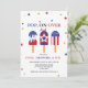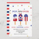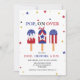 Festa de 4 de julho bonita convida com fotos de picolés vermelhos, brancos e azuis no topo. A frase "pop on over" está escrita em letras azuis fortes, e o nome do seu filho, a idade e as informações da festa são mostrados abaixo. Os convites para o aniversário de 4 de julho invertem-se para mostrar um padrão de aspersão vermelha e branca.