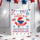 4 De Julho De Barbeque - Convite Para O Dia Da Independência Do CHURRASCO. Este design apresenta uma grelha barbeque com fogos de artifício, bandeiras americanas e luzes de cordas. Personalize este design personalizado com seu próprio quarto de detalhes de julho. Azul claro riscado para trás.