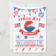 4 De Julho De Barbeque - Convite Para O Dia Da Independência Do CHURRASCO. Este design apresenta uma grelha barbeque com fogos de artifício, bandeiras americanas e lanternas. Personalize este design personalizado com seus próprios detalhes do quarto de julho. Vermelhos, dormente.