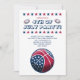 Jogos desportivos inspiraram convite para uma festa de churrasco de 4 de julho com ilustrações de bolas de basquete, bolas de futebol e baseball.