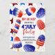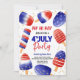 Bonito convite de aniversário em estilo. Tema: Aniversário do Dia da Independência em 4 de julho. Aniversário. Estilo: Bonito, Cheio, Divertido. Cores: Vermelho, Azul, Branco, Dourado. Gráficos: bandeira dos EUA, estrelas, picolés.