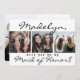 Uma maneira séria de pedir a sua melhor amiga para compartilhar seu dia especial é dar a ela um presente personalizado de colagem de fotos que ela pode guardar como um guardião. Este cartão de convite de apresentação de propostas moderna chic é uma maneira elegante de dizer "será a minha madrinha de casamento?" Todas as imagens e textos são simples de personalizar. (DICA DE IMAGEM: Uma maneira fácil de centralizar uma foto exatamente como você deseja é recortá-la antes de carregá-la no site do Zazzle.) A design a preto e branco apresenta quatro fotos de amizade de sua escolha, caligrafia moderna com script manuscrito, tipografia minimalista da máquina de escrever e um coração rosa bonito. Esta modelo de cartas de apresentação é uma maneira única de pop a pergunta ao seu bff e fazer a celebração do casamento começar em estilo. Exemplo de créditos de imagem: a frente esquerda é de Sam Manns (@sammanns94 on Unsplash) e a frente direita é de Florian Hausleitner no Pixabay.