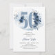 50º convite de aniversário com o número 50 decorado com rosa-buds, florais e folhagem em tons de azul litorâneo e areia. Design sutil feminino e elegante com arranjos florais de aquarela, decapantes de tinta e pinceladas. Perfeito para comemoração de 50 anos com vibe costeira, casa de praia ou lago ou local de entrada de água, por exemplo.