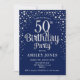 50º Convite de aniversário. Design elegante em azul marinho escuro e prata brilhante fraca. Possui fonte de script na moda e confetti. Envie-me uma mensagem se precisar de idade personalizada.
