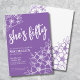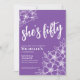 Elegante 50º Convite de aniversário Roxo 50º. Um divertido, mas elegante, 50º convite de aniversário com flores roxas e brancas giras para os jovens de coração. Um padrão de flores brincalhão enquadra uma tipografia de script "ela tem cinquenta anos" misturada com uma fonte mais clássica de serifa. Celebrar cinquenta anos de vida com esta bela design botânica. A parte divertida é que você pode mudar TODAS as cores! Você não só pode mudar as cores e a fonte de fundo, como também pode mudar as linhas das flores. Disponível como um convite impresso ou como um convite digital para download que você pode enviar por e-mail ou que foi impresso localmente!
